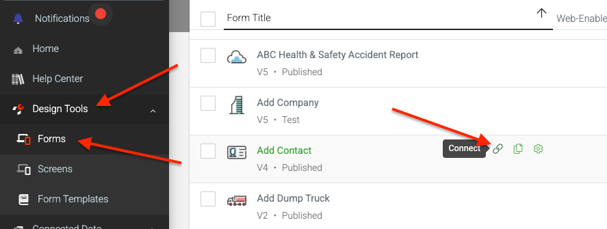 - Hover over a form and click the “Connect” icon link