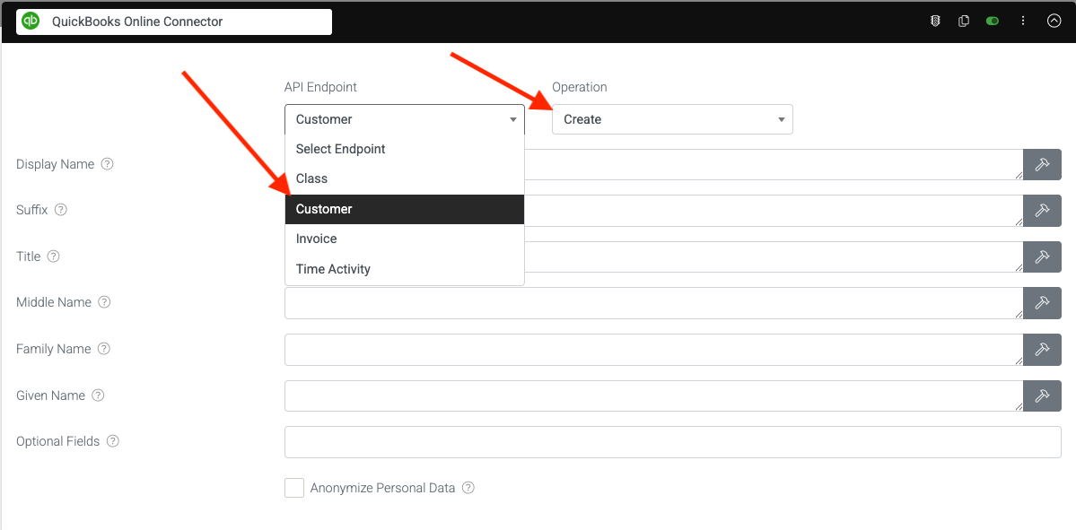 Depending on the selections, various properties become available to create or update data in QuickBooks with form-captured data by referencing field datanames or using a formula.